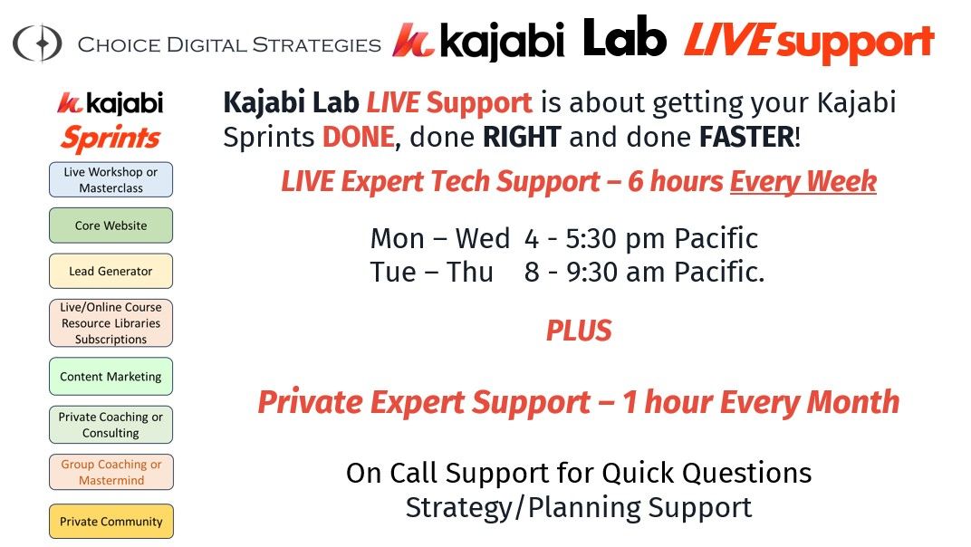 - Kajabi Lab LIVE Support - four 90-minute implementation sessions every week plus on call support